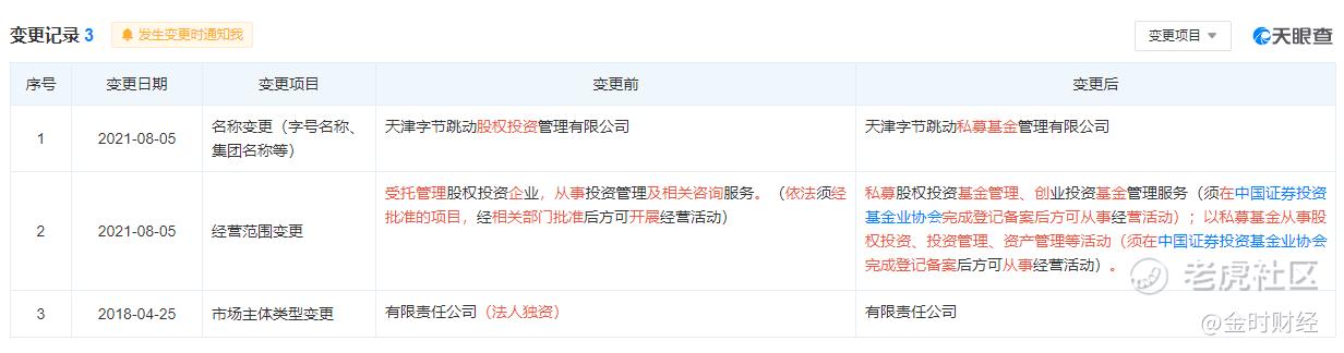 8月5日,字节跳动旗下投资公司原天津字节跳动股权投资管理有限公司发生工商变更,正式更名为天津字节跳动私募基金管理有限公司。