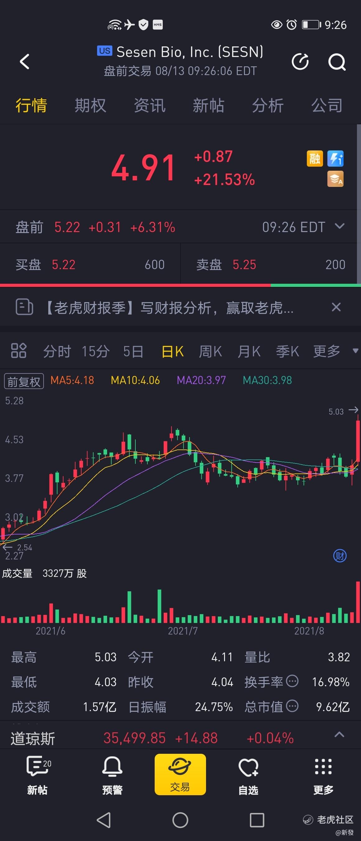 $Sesen Bio, Inc.(SESN)$盘前5.22买入,盘中最高6块,利润近18%,轻轻的黑天鹅出来了,一波以0.86的价给我带走了2440股,损失约-13000[开心] [开心] [开心] ,首先这就是我说的其中的一种黑天鹅事件了,大家都是股市大海中其沧海一粟,有潮起潮落,有赚就有赔,我在与不在,此FDA过与不过,我们本就是被规则设定好的,我们大不过规则。论坛又是官方推荐的各抒己见,交流互动的地方。我发贴其目的有二,1,记录自己的经历(很多次贴中有回复我只是表达自己的意见)。2,其记录经历的贴子会被很多股友看到,共同见证,贴子极少回复告之卖出价格。是因为我也不知道能涨到多少。虽然我每日发数贴买对暴票的概率高达70%,我自己还是严格尊守风控与资金管理的同时也把操作方法与细节分享其。我也是有众多的不足哈,否则我那有闲空来讨论天天吹牛逼 [开心] [笑哭] [开心],最后恭喜我运气真的不错。因其给我带来的富贵经验远超小小亏损。昨天猜大盘涨又赢了,等待下周的白天的,大家周末快乐[得意] [得意] [得意]