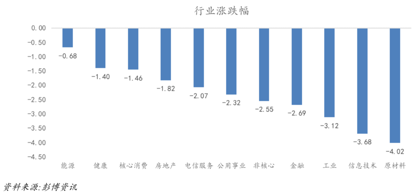美股方面,标普500行业指数中全部行业均录得跌幅,其中跌幅最大的五个行业分别为原材料(-4.02%)、信息技术(-3.68%)、工业(-3.12%)、金融(-2.69%)、非核心(-2.55%)。
