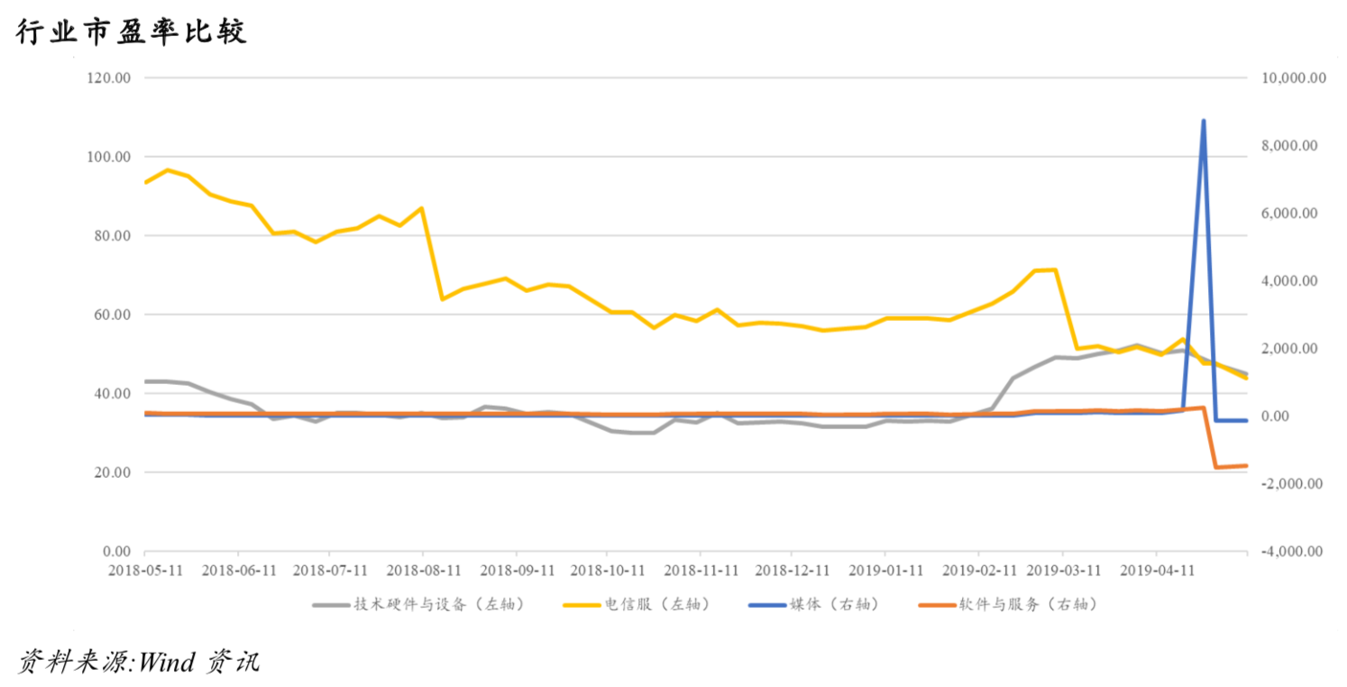 截止到目前,软件与服务、技术硬件与设备、电信服务、媒体四个板块的收盘市盈率(TTM)分别为-1463.65、45.03、43.82、-141.47,技术设备、电信服务板块市盈率较上周有所下跌,技术设备、电信服务板块较沪深300指数的13.05倍的估值溢价分别为276%、266%。