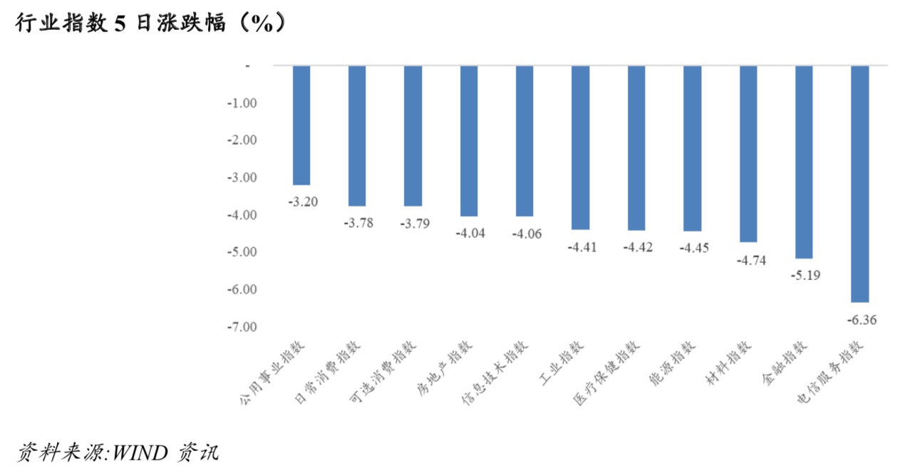 从WIND数据来看,A股市场按GICS一级行业分类全部录得跌幅,其中跌幅最大的五个行业为:电信服务指数(-6.36%)、金融指数(-5.19%)、材料指数(-4.74%)、能源指数(-4.45%)、医疗保健指数(-4.42%)。