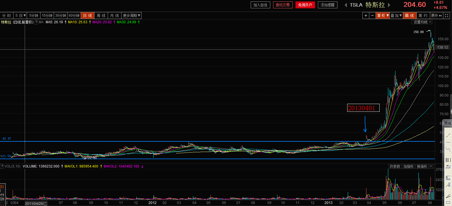 tsla上市以来走了三个平台,第一平台走势稳定,关注度不高。2013年4月1日以跳空高开方式脱离第一平台的底部区间。