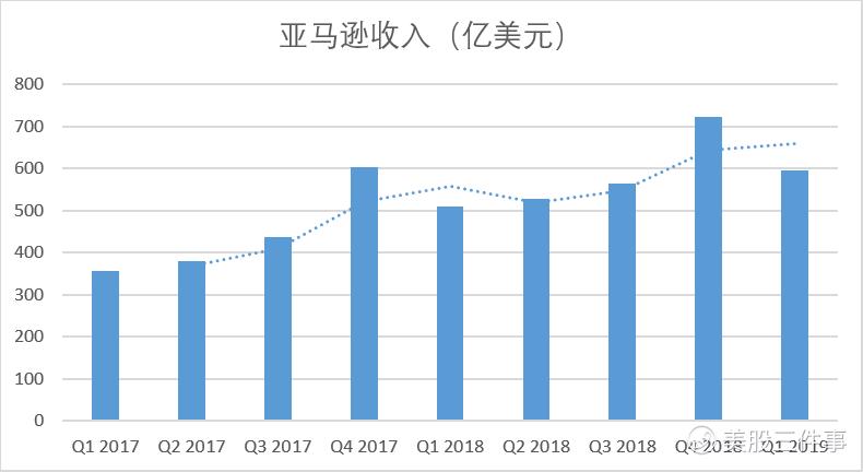 亚马逊2019年第一季度的收入为597亿美元,相比于2018年第四季度的723.83亿美元下滑了17.52%。亚马逊的收入共分为两个板块分别是商品销售、服务销售两个板块。2019年第一季度来自商品销售板块的收入为342.83亿美元,来自服务业务的收入为254.17亿美元。