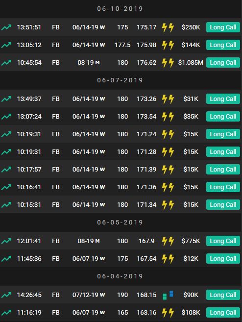 2019年6月3日盘中,实战期权系统扫描发现连续不断的$FB短期看涨Call期权异动。【详见期权异动头条——$FB(反垄断)】