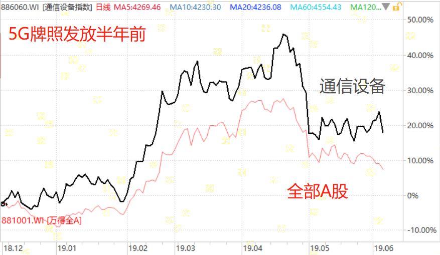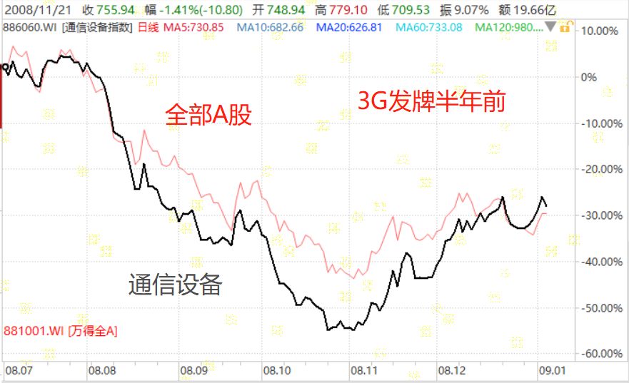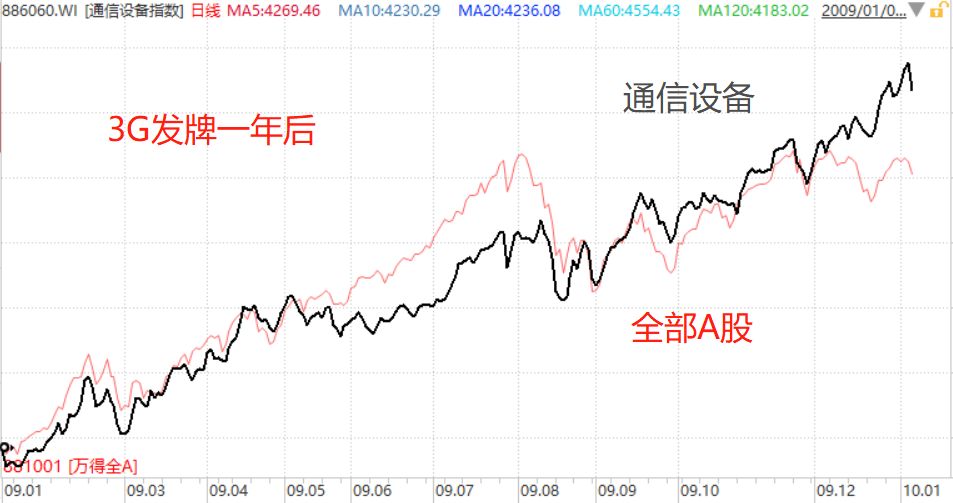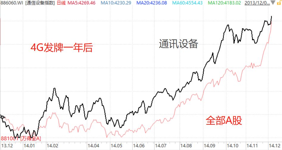 所以从3G和4G的经验来看,虽然通信设备换代升级是明确的业绩利好,但是股票价格还是炒预期,在利好落地之前,股票价格就已经提前反应了,等到发牌之后,股价就已经不低了,这时候如果在高点买,就不一定后续还能跑赢大盘。