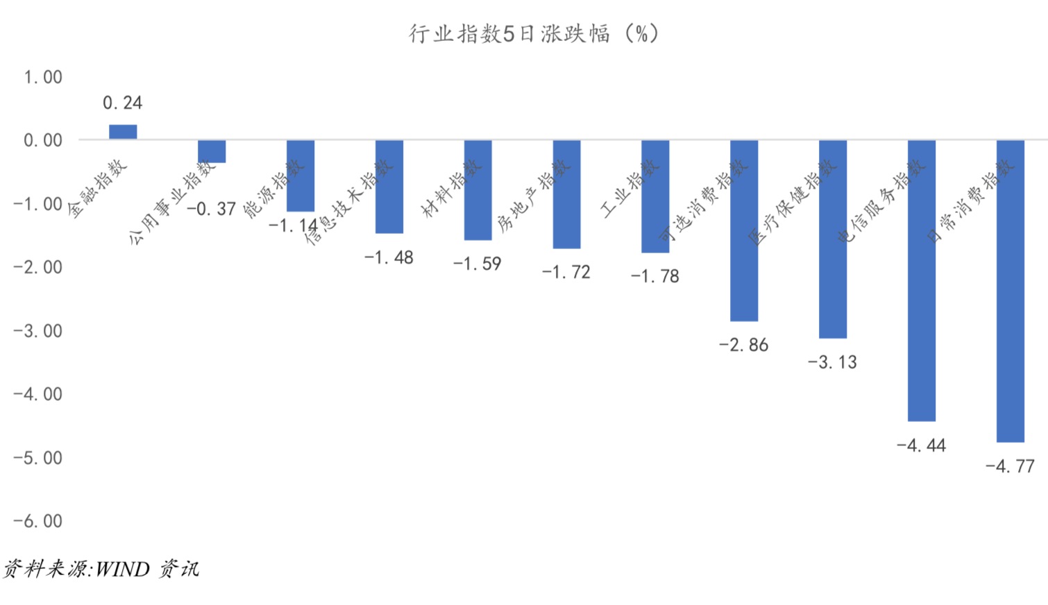 从WIND数据来看,A股市场按GICS一级行业分类,行业指数除金融指数外均录得跌幅,医疗保健指数5日跌幅为-3.13%。