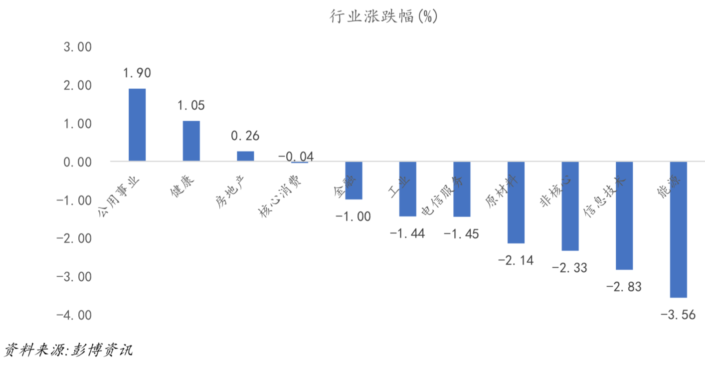 美股方面,根据标普500行业指数表现,除信息技术与工业均录得跌幅,排名前五的行业分别为公用事业(1.90%)、健康(1.05%)、房地产(0.26%)、核心消费(-0.04%)、金融(-1.00%)。