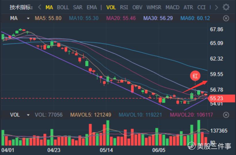 截至美东时间6月25日盘后,中国石油目前的股价为55.23美元。公司股价在3月20日创出阶段性新高67.61美元,经过小幅调整后,公司曾出现过一波比较大的跌幅。股价一举跌破5日和10日均线。此后公司股价一路下跌,并在6月12日创出阶段性新低52.935美元。随后公司股价开始从低位反弹。目前仍处在反弹进程中。