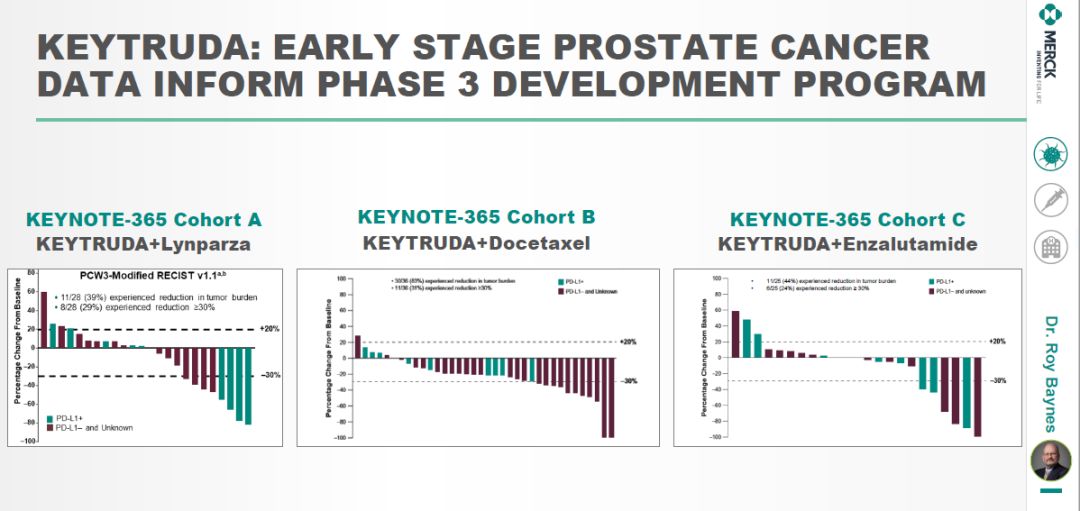 前列腺癌将是Keytruda研发的另一个重要领域。根据该公司的报告,默沙东目前拥有广泛的前列腺癌临床研发项目,可能治疗40%的前列腺癌患者。包含Keytruda的组合疗法在早期临床试验中也获得积极结果。▲Keytruda治疗前列腺患者的疗效结果(图片来源:参考资料[1])