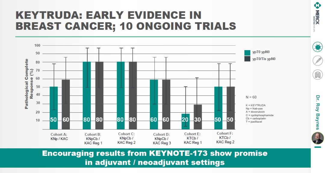 Keytruda目前正在进行的临床试验中,有超过100项是作为新辅助/辅助疗法治疗早期癌症患者。其中,在治疗局部晚期三阴性乳腺癌(TNBC)患者的KEYNOTE-173早期临床试验中,Keytruda与化疗结合,作为新辅助疗法显示出可喜的疗效。▲Keytruda治疗局部晚期乳腺癌患者的疗效(图片来源:参考资料[1])