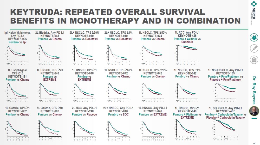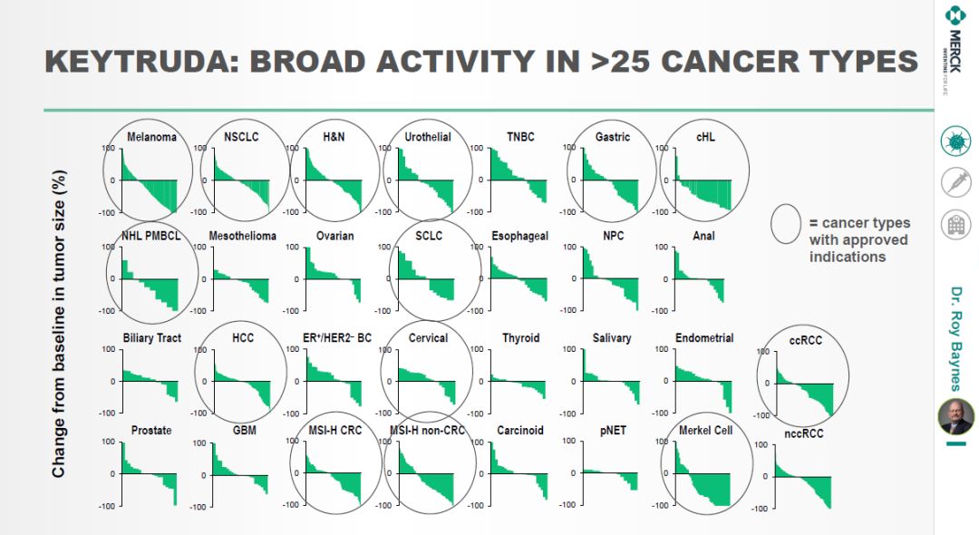 默沙东研究实验室首席医学官Roy Baynes博士用两张内容满满的幻灯片展现了Keytruda做为单药或组合疗法的基石,不但能够在多种癌症中将肿瘤缩小,而且延长了患者的总生存期。