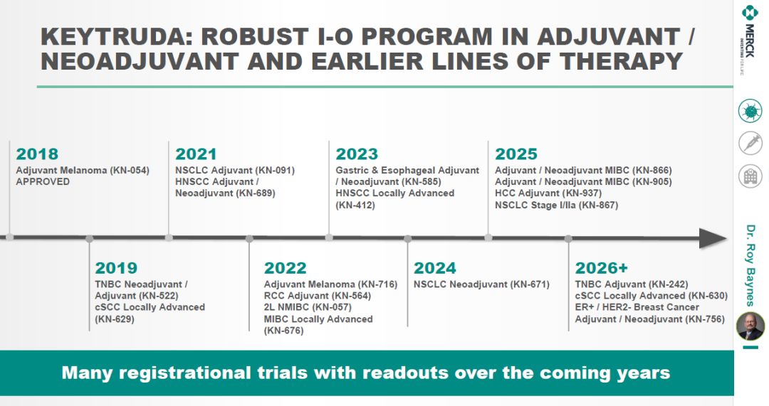 在投资者大会上,Roy Baynes博士给出了多项新辅助/辅助疗法和早期疗法研究项目的时间表,多项可能进一步扩展Keytruda应用范围的注册性临床试验将在未来几年中获得试验结果。▲多项注册性临床研究将获得结果(图片来源:参考资料[1])