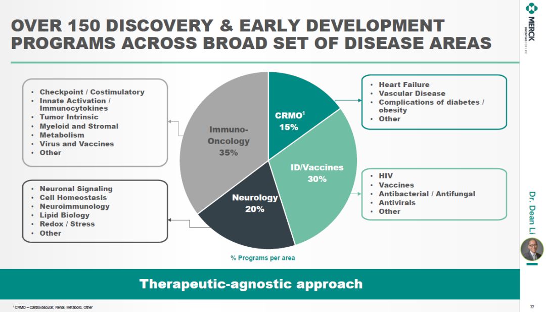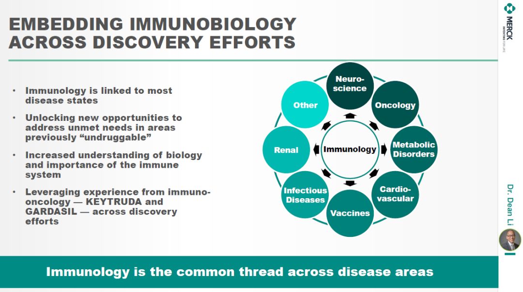 默沙东研究实验室发现科学和转化医学高级副总裁Dean Li分享了默沙东的早期研发策略。他表示,免疫学与大多数疾病相关。默沙东的早期研发工作将利用自身在开发Keytruda和Gardasil时在免疫学方面积累的经验和专长,进一步理解免疫系统的重要性,开拓在以前“不可成药“领域的新机会。▲默沙东早期研发策略(图片来源:参考资料[1])
