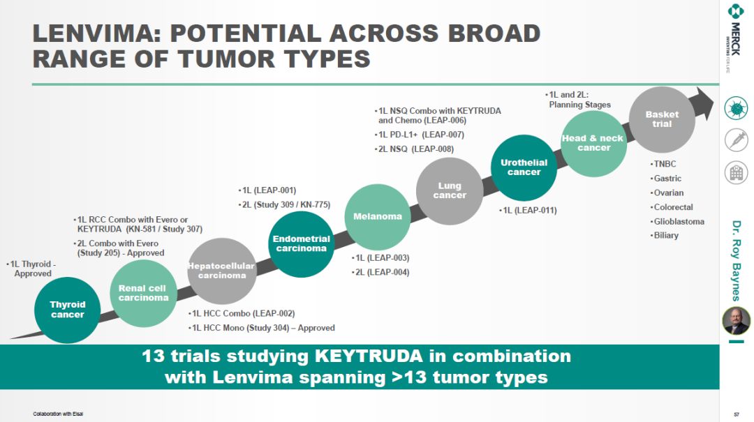 Lenvima目前在13项临床试验中与Keytruda联用治疗超过13种癌症类型。据默沙东估计,到2023年,这三款药物的适应症可能是现在的三倍!
