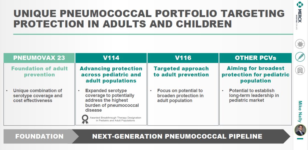 在预防肺炎的疫苗研发方面,该公司拥有多款下一代在研疫苗产品,其中15价V114肺炎球菌多糖结合疫苗已经获得美国FDA授予的突破性疗法认定,并且在2期临床试验中表现出积极预防结果。▲默沙东肺炎疫苗研发管线(图片来源:参考资料[1])