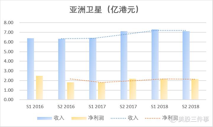 公司的财务情况亚洲卫星2018年下半年的收入为7.11亿港元,比2018年上半年的7.3亿港元轻微下降了3%。亚洲卫星的收入一直较为稳定,从2016年上半年,到2018年下半年,公司各报告期的收入分别为6.4亿港元、6.32亿港元、6.42亿港元、7.12亿港元、7.3亿港元和7.11亿港元。公司的收入从2017年开始出现稳步增长。