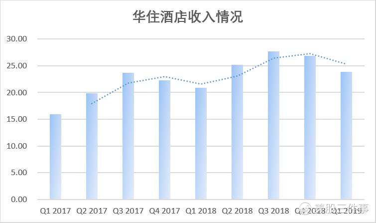 华住酒店2019年第一季度的收入为23.87亿元,相比于2018年第四季度的26.83亿元下降了12.4%华住酒店2018年第一季度到2019年第一季度,各个季度的收入分别为20.91亿元,25.21亿元,27.68亿元,26.83亿元和23.87亿元。从季度角度来看,公司的季度收入波动不大,始终保持在20亿元以上的水平。
