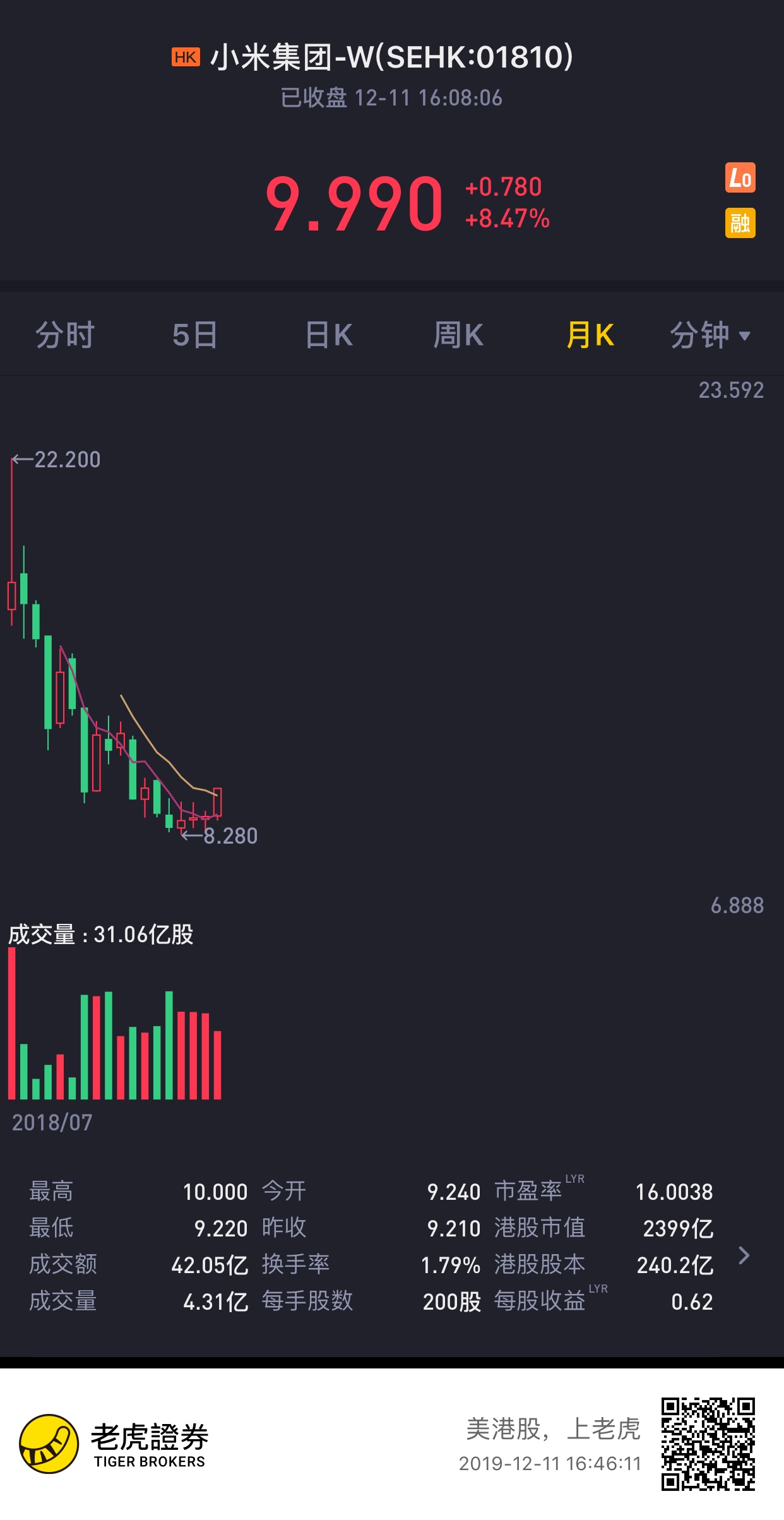最高点抄底5000股,中间一边跌一边割肉,8块多的时候手痒又入手,中间一直就没赚过,终于呀!守得云开见月明。能开荤了$小米集团-W(01810)$