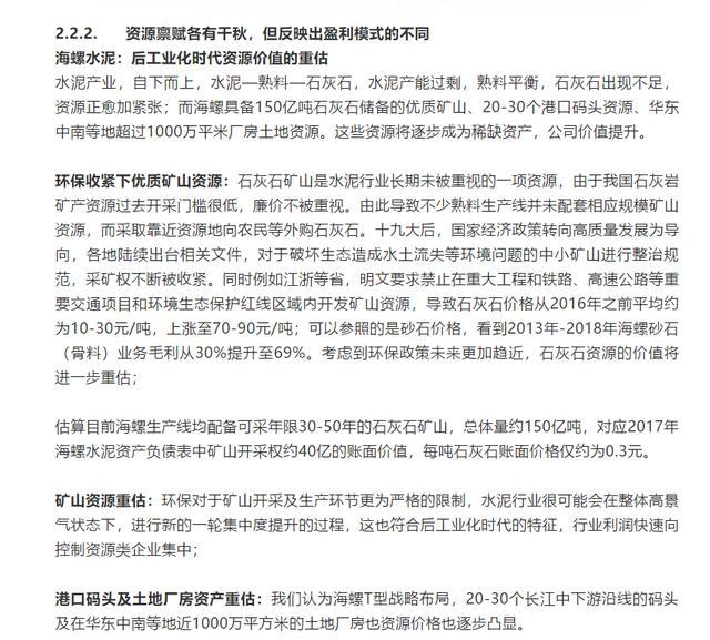 与此同时,在同时期的长江证券分析报告"剖析海螺水泥的投资价值"中,关于海螺水泥拥有的矿山资产价值,是这样描述的:"T 型战略具备明显的先发优势,竞争对手难以复制。首先矿山资源有限,一旦取得采矿权,长期有效。一般大型矿山采矿权30 年,小型亦有10 年之久,海螺水泥的矿山资源储备达30 年以上;此外码头物流渠道有限,从熟料出厂到最终的终端市场,需要经过多次运输,近期针对长江流域的治理已经凸显出优质物流码头的重要性。",绝口不提矿产资产价值重塑给企业带来的增值。
