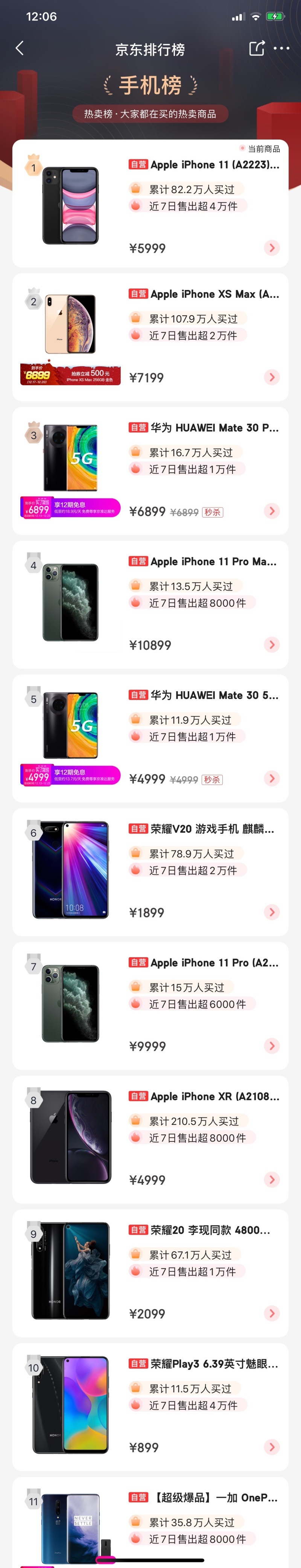 iPhone京东销量还是无敌,11为mate30系列两倍!