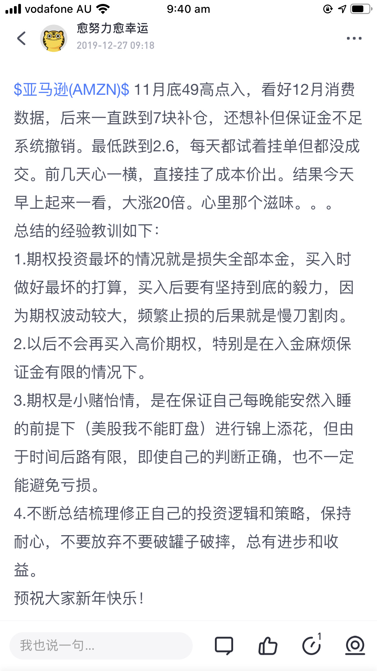 {"i18n":{"language":"zh_CN"},"detailType":1,"isChannel":false,"data":{"magic":2,"id":913150154,"tweetId":"913150154","gmtCreate":1577400185578,"gmtModify":1704335707404,"author":{"id":3434075468146673,"idStr":"3434075468146673","authorId":3434075468146673,"authorIdStr":"3434075468146673","name":"愈努力愈幸运","avatar":"https://static.tigerbbs.com/4f9a0871eea609daf589ec5cd2266587","vip":1,"userType":1,"introduction":"","boolIsFan":false,"boolIsHead":false,"crmLevel":2,"crmLevelSwitch":0,"individualDisplayBadges":[],"fanSize":11,"starInvestorFlag":false},"themes":[],"images":[{"img":"https://static.tigerbbs.com/f8bb72fb07be50bcd13e94a3ae785334","width":"1242","height":"2208"},{"img":"https://static.tigerbbs.com/fd077a8f88e5806281e364591d2ec73d","width":"1242","height":"1057"}],"coverImages":[{"img":"https://static.tigerbbs.com/f8bb72fb07be50bcd13e94a3ae785334","width":"1242","height":"2208"}],"extraTitle":"","html":"<html><head></head><body> <a href=\"https://laohu8.com/S/AMZN\">$亚马逊(AMZN)$</a>总也发不成功,请大家看截图吧。一点小小总结和感悟,曾经6000刀浮亏到500刀,最后虽然没有赚钱,但是安慰自己有所得,今后不能这样刀尖上行走了。<img src=\"https://static.tigerbbs.com/f8bb72fb07be50bcd13e94a3ae785334\" tg-width=\"1242\" tg-height=\"2208\"><img src=\"https://static.tigerbbs.com/fd077a8f88e5806281e364591d2ec73d\" tg-width=\"1242\" tg-height=\"1057\"></body></html>","htmlText":"<html><head></head><body> <a href=\"https://laohu8.com/S/AMZN\">$亚马逊(AMZN)$</a>总也发不成功,请大家看截图吧。一点小小总结和感悟,曾经6000刀浮亏到500刀,最后虽然没有赚钱,但是安慰自己有所得,今后不能这样刀尖上行走了。<img src=\"https://static.tigerbbs.com/f8bb72fb07be50bcd13e94a3ae785334\" tg-width=\"1242\" tg-height=\"2208\"><img src=\"https://static.tigerbbs.com/fd077a8f88e5806281e364591d2ec73d\" tg-width=\"1242\" tg-height=\"1057\"></body></html>","text":"$亚马逊(AMZN)$总也发不成功,请大家看截图吧。一点小小总结和感悟,曾经6000刀浮亏到500刀,最后虽然没有赚钱,但是安慰自己有所得,今后不能这样刀尖上行走了。","highlighted":1,"essential":1,"paper":1,"likeSize":7,"commentSize":2,"repostSize":0,"favoriteSize":0,"link":"https://laohu8.com/post/913150154","repostId":0,"isVote":1,"tweetType":1,"viewCount":3917,"commentLimit":10,"likeStatus":false,"favoriteStatus":false,"reportStatus":false,"symbols":["AMZN"],"verified":2,"subType":0,"readableState":1,"langContent":"CN","currentLanguage":"CN","warmUpFlag":false,"orderFlag":false,"shareable":true,"causeOfNotShareable":"","featuresForAnalytics":[],"commentAndTweetFlag":false,"andRepostAutoSelectedFlag":false,"upFlag":false,"length":144,"xxTargetLangEnum":"ZH_CN"},"commentList":[{"id":2030013,"commentId":"2030013","gmtCreate":1577402906589,"gmtModify":1577402906589,"authorId":3472266979775387,"author":{"id":3472266979775387,"idStr":"3472266979775387","authorId":3472266979775387,"name":"知行合一稳增长","avatar":"https://static.tigerbbs.com/864e788113b4587ce86cde021e6a27be","vip":1,"currentWearingBadge":{"badgeId":"976c19eed35f4cd78f17501c2e99ef37-1","templateUuid":"976c19eed35f4cd78f17501c2e99ef37","name":"博闻投资者","description":"累计交易超过10只正股","bigImgUrl":"https://static.tigerbbs.com/e74cc24115c4fbae6154ec1b1041bf47","smallImgUrl":"https://static.tigerbbs.com/d48265cbfd97c57f9048db29f22227b0","grayImgUrl":"https://static.tigerbbs.com/76c6d6898b073c77e1c537ebe9ac1c57","redirectLinkEnabled":0,"hasAllocated":1,"isWearing":1,"stampPosition":0,"hasStamp":0,"allocationCount":1,"allocatedDate":"2021.12.21","individualDisplayEnabled":0,"individualDisplaySort":0,"categoryType":1102},"hat":"https://static.tigerbbs.com/f84d87792f02cf78e80ee34979fd31e5","crmLevel":6,"crmLevelSwitch":1,"individualDisplayBadges":[]},"repliedAuthorId":0,"objectId":913150154,"objectIdStr":"913150154","type":1,"supId":0,"supIdStr":"0","prevId":0,"prevIdStr":"0","content":"可以进行跨式期权投资策略,波动率大可以用时间来左右,如果只裸买卖期权,最后都是亏完本金<br>","text":"可以进行跨式期权投资策略,波动率大可以用时间来左右,如果只裸买卖期权,最后都是亏完本金<br>","html":"可以进行跨式期权投资策略,波动率大可以用时间来左右,如果只裸买卖期权,最后都是亏完本金<br>","likeSize":1,"commentSize":0,"subComments":[],"verified":10,"allocateAmount":0,"commentType":"valid","coins":0,"score":0,"disclaimerType":0},{"id":2030066,"commentId":"2030066","gmtCreate":1577405883096,"gmtModify":1577405883096,"authorId":3499792681985087,"author":{"id":3499792681985087,"idStr":"3499792681985087","authorId":3499792681985087,"name":"琴心","avatar":"https://static.tigerbbs.com/7667b9782cfbd0655e2542d2e3ec0022","vip":1,"crmLevel":2,"crmLevelSwitch":0,"individualDisplayBadges":[]},"repliedAuthorId":0,"objectId":913150154,"objectIdStr":"913150154","type":1,"supId":0,"supIdStr":"0","prevId":0,"prevIdStr":"0","content":"说得太好了!","text":"说得太好了!","html":"说得太好了!","likeSize":0,"commentSize":0,"subComments":[],"verified":10,"allocateAmount":0,"commentType":"valid","coins":0,"score":0,"disclaimerType":0}],"isCommentEnd":false,"isTiger":false,"isWeiXinMini":false,"url":"/m/post/913150154"}