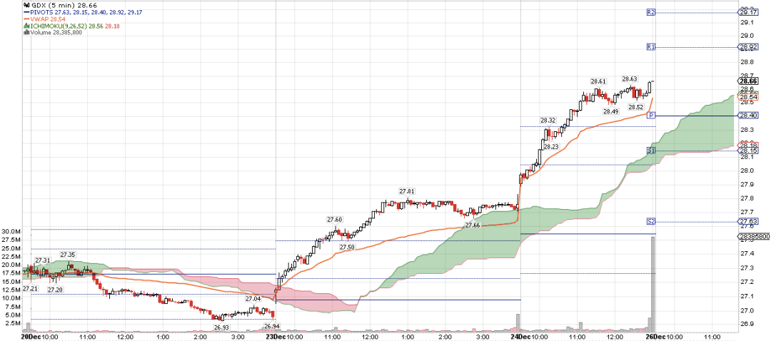 ichimoku cloud:20日GDX在云层之下运行,弱势;23及24日GDX在云层之上运行,强势。