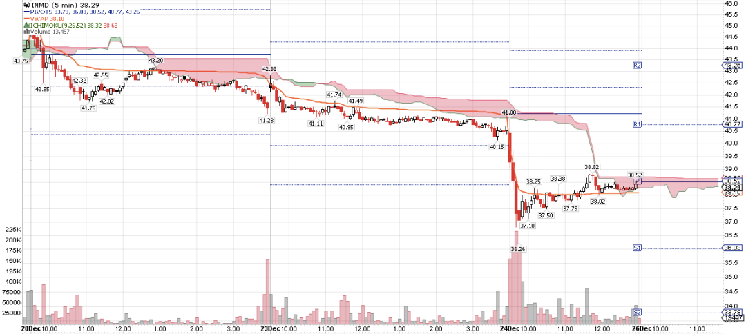 下文主要从INMD能否抄底这个问题出发,就抄底后如何跟踪观察等问题,介绍各个时间窗口支撑阻力的看盘技巧。