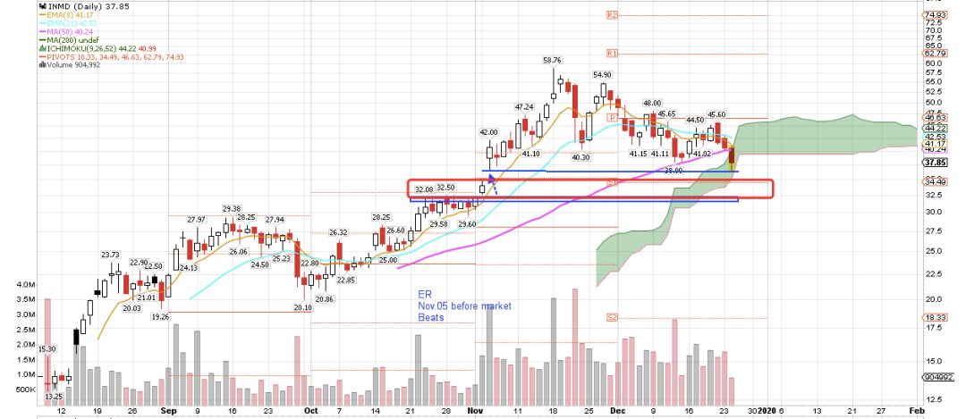 上面说的都是ichimoku cloud日内看盘,再说下ichimoku cloud日线级别看盘,请看“图1”,昨天INMD恰好跌到了云层内,是个潜在的支撑位。