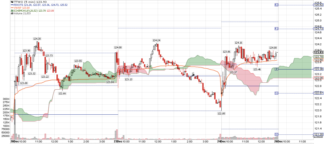 首先,复习下前面的知识点,TTWO 5分钟K线在橙色线VWAP之上,表示当日强势,VWAP是支撑;其次,TTWO开盘第一根5分钟K线就拉过了Pivot Point 122.8,随后10分钟,回踩确认,直接拉到R1 123.54之上,撑压互换,R1变为支撑,直到收盘,TTWO始终没有跌破VWAP及R1支撑位。