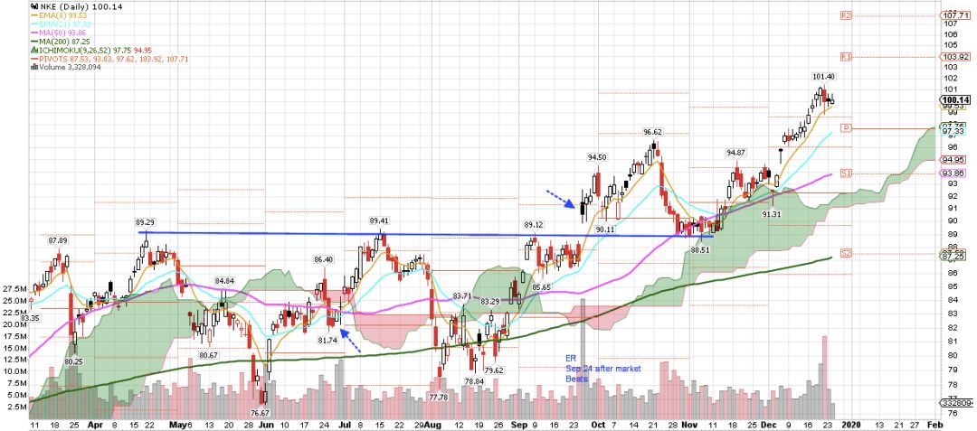 下方“图8”,耐克NKE的日线图。9月24日盘后财报,25日放量高开,形成财报anchor bar,突破高点92.55看多,低点89.9是支撑,后面似乎一切都在预期之中,在财报anchor bar低点支撑住开始往上拉,到了10月份,前5根K线有3根测试了当月Pivot Point 90区域,然后一路走高,直到22日开始下挫,29日直接跌破Pivot Point(记得前面说的FLAG么),开始补gap,在89-90之间盘整了差不多12天(亦接近云层支撑)才开始往上拉, 11月月中成功突破Pivot Point 91.5区域,22日回踩确认。进入12月,12月3日回撤测试了11月的Pivot Point,当日成功收在12月的Pivot Point 92之上,强势的表现,随后一路上涨。