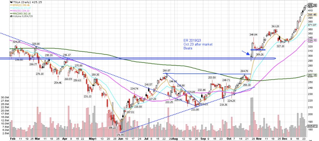 再举个例子,下方“图6”,特斯拉TSLA的日线图。10月23日盘后财报,24日放量高开,形成财报anchor bar,突破高点304.93看多,25日继续放量大涨9.5%,25日这根大K线一半的位置就是支撑,后续走势,确实有一定支撑力度。