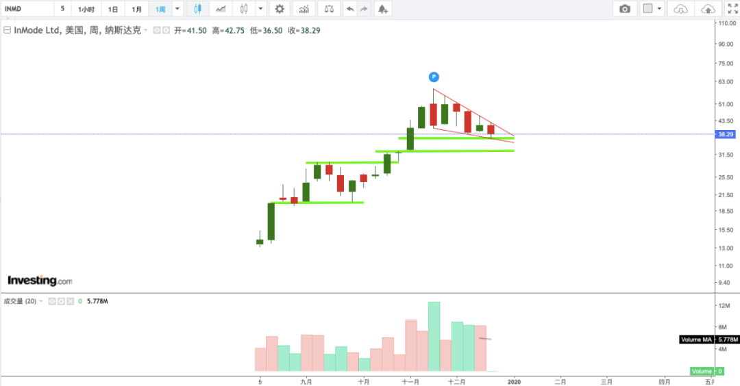 INMD周线级别bull flag pattern,具体price pattern方面的内容这次不介绍了,参考下面2个图即可。