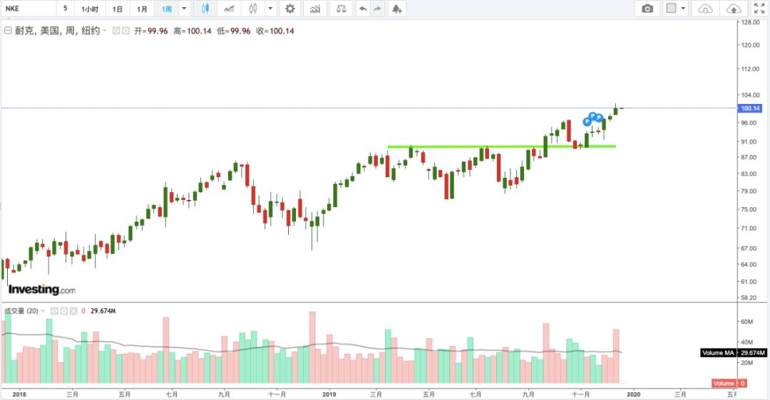 来看下NKE的周线裸K线。如下方“图9”,注意我画的绿线,4月以来至少冲击了3次89区域,直到9月份成功突破,那11月回撤突破区域89,恰巧也是9月突破周K线的一半,是不是特别make sense?