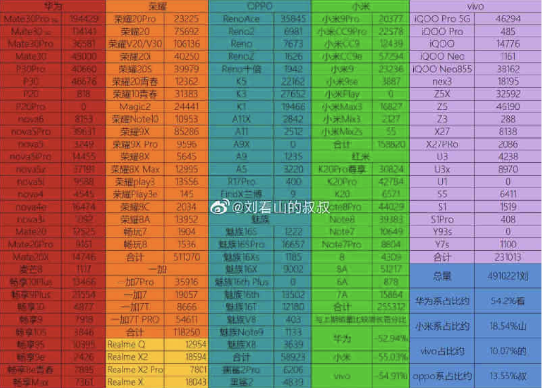 4、华为系销量占国产手机销量超过了一半,达到了54.2%。
