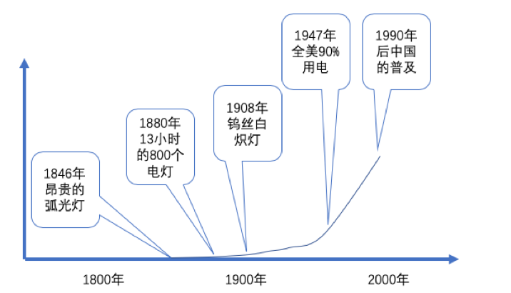 在1882年9月4日,他终于点亮了85家企业里的800盏电灯。从这一天,到1908年钨丝白炽灯的发明,到1947年的全美国90%的家庭用上了电,过去了65年的时间,到中国十一届三中全会后的普及使用,过去了将近150年。