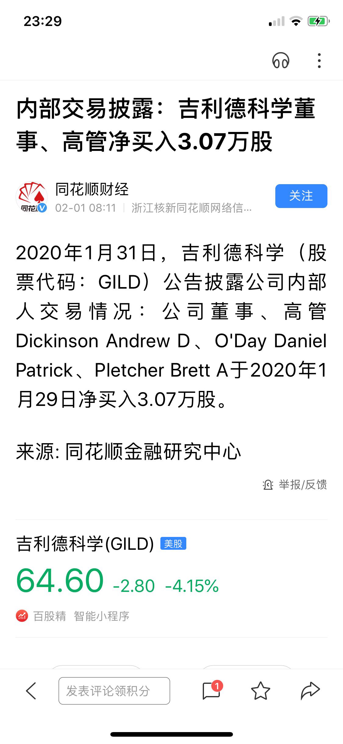 吉利德高管1月29日和1月31日500多万美金增持股票