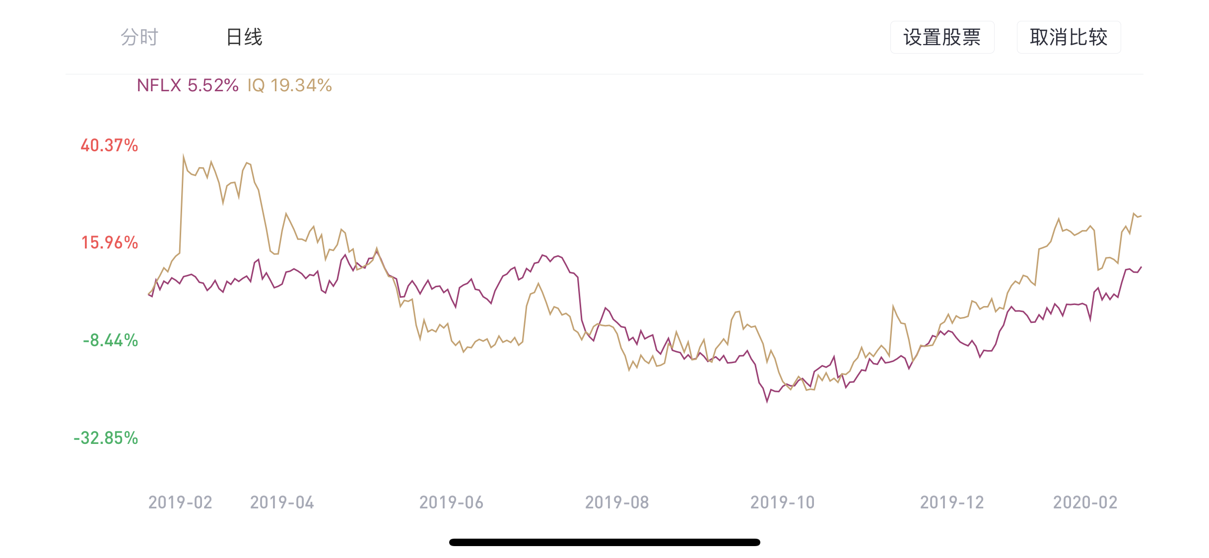 我们用爱奇艺和奈飞的股价来做对比,过去一年爱奇艺股价表现优于奈飞,过去一年爱奇艺股价上涨了19.34%,而奈飞仅上涨了5.52%,可以看出爱奇艺接下来追求利润最大化的目标下,同时在疫情期间的流量大增,我们相信2020年Q1财报可能会给大家带来惊喜。$爱奇艺(IQ)$$腾讯控股(00700)$