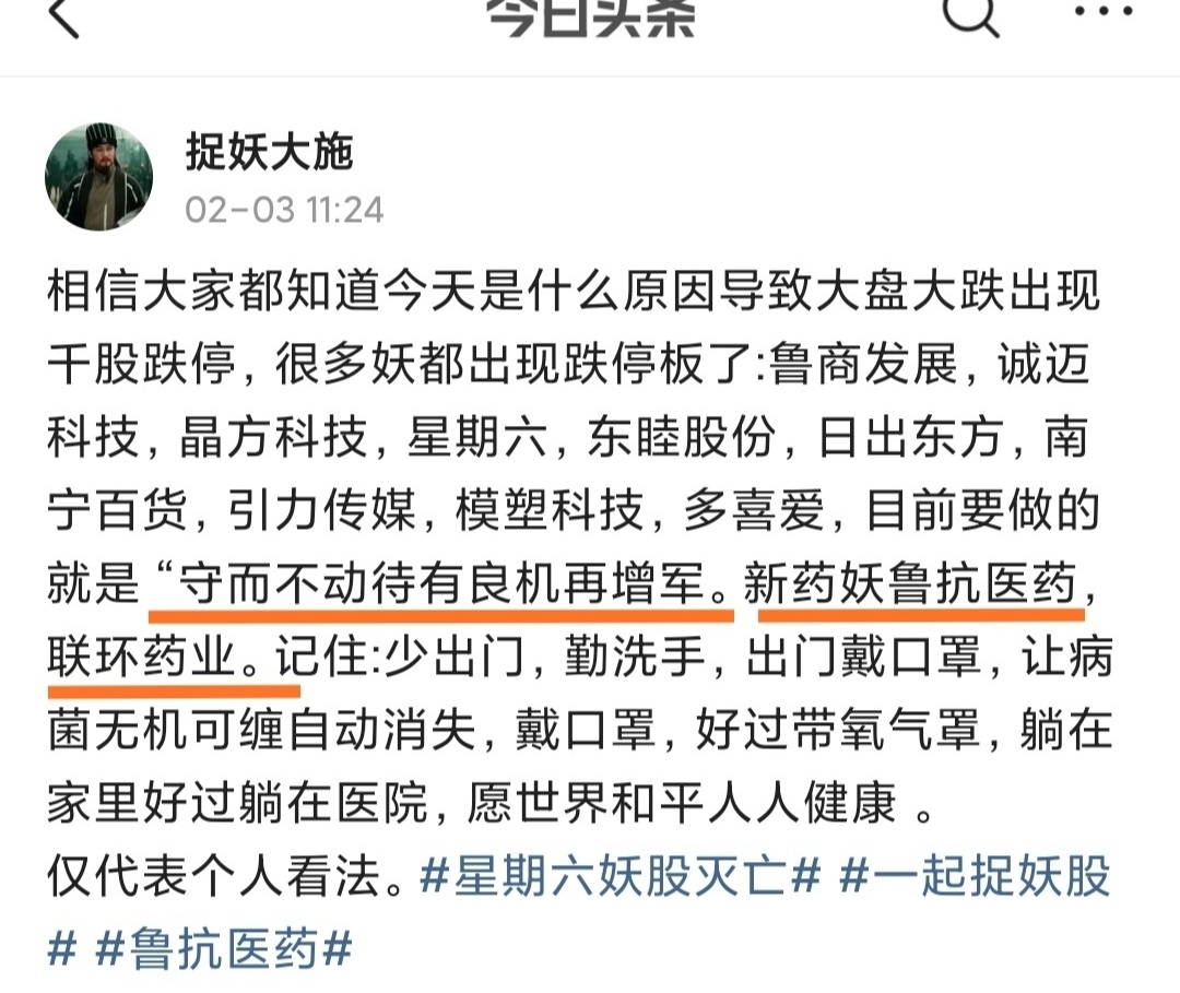 在2月3日文章中已认定新药妖为鲁抗医药连环药业,面对千股跌停,很多朋友恐慌不知所措,如何应对大施也给出好的良策“守而不动待有良机在增军,意:坚持守住不动,等待好良机再加上仓,结果真出现最佳加仓时机,看到那么多朋友私信的感谢,证明多数都理解我文章的寓意了,文章没有白写啊!$鲁抗医药(600789)$ $联环药业(600513)$ $模塑科技(000700)$ $多喜爱(002761)$ $星期六(002291)$ $东睦股份(600114)$