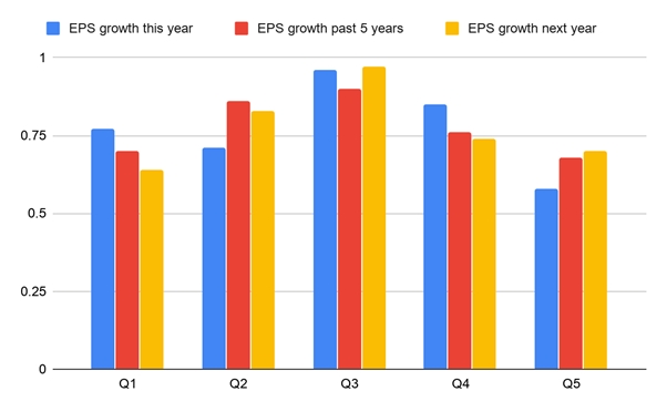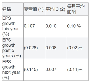 我们要检测的就是,把成长性最高的前20%的公司所建立的好学生投资组合,是不是真的会跑赢成长性最低的那群坏学生投资组合。是不是成长性高的公司意味著股价就真的比较会飙。一起来研究研究吧!巴菲特曾经说过:「如果能够慢慢找出盈馀持续成长的投资组合,你就会发现复利、市值也会跟著稳定增加。虽然我们很少承认,但这正是波克夏股东累积财富的方式。」就让我们一步步解构公司盈馀及盈馀表现对公司股价的影响性。首先,先来了解每股盈馀的定义:每股盈馀(Earnings Per Share,EPS)是指公开上市公司,公司获利给每股给投资者/股东带来的收益。EPS为公司获利能力的最后结果,每股盈馀高代表著公司每单位资本额的获利能力高,这表示公司具有某种较佳的能力。如:产品行销、技术能力、管理能力等等,使得公司可以用较少的资源创造出较高的获利。对于上市公司而言,每股盈馀和公司的股价有一定的联动性,因此这也是公司现有股东与潜在投资者衡量公司获利的关键要素之一。EPS的计算也非常简单,最基本的公式为:每股盈馀=(净利 – 优先股股利)/ 加权平均股数本业的每股获利,通常也代表著该年度所能配发的股利。因为优先股相对于普通股具有优先分配权,因此计算每股盈馀前,税后净利中需要扣除优先股的股利。在计算上,若数字越高,表示公司获利能力越高。实务上,分析师都会看公司的EPS是否有稳定及持续成长,不会突然有大幅衰退,顶多因为季节性造成四季的EPS不大一样。如果发现某一期EPS突然大幅衰退,就要格外留意原因。反之如果EPS突然某一期急速上升,也要观察是否是一次性获利,还是整体获利能力提高。另外,通常如果一间公司过去到现在EPS持续成长,表示具有成长性,那股价通常也会水涨船高。以下我们就实际检测看看,是否我们过去认为的指标具有选股的效益,此次主要检测EPS growth this year (%)、EPS growth past 5 years (%)跟EPS growth next year (%)三种比率。白话来说,就是一间公司过去一年的EPS成长率,过去五年EPS的成长率以及分析师对于未来一年EPS的预估的成长率。检测的方式为,每个月依照这些比率排序S&P500指数的成分股分成五群(Q1-Q5),每一群就是一个投资组合,回测的时间为15年(2004/11-2019/11)。也就是说,Q1就是成长性最高的前20%的公司所建立的投资组合,也就是好学生代表。我们要检测的就是,是不是好学生的股价也会跑赢坏学生,还是其实成长性不高的坏学生反而才比较会涨。分位数投组报酬表现统整
