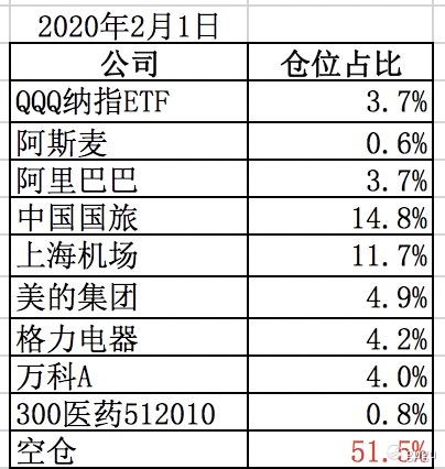 我自己的持有的正股,过节期间买入一点QQQ。接下来会先重点看受疫情影响较弱的阿里,BaBa的股价到180和165,都是不错的买入点。国旅和上海机场受疫情影响,2020年Q1收入估计会锐减70%,Q2是否恢复看整体控制情况。不过疫情影响的都是3-6个月收入,买入的大逻辑没有变。如果有空仓位的,可以分5次在2月底-5月底(Q1财报4月底)之间慢慢不断买入,毕竟黄金坑都是被“极度行情”砸出的。