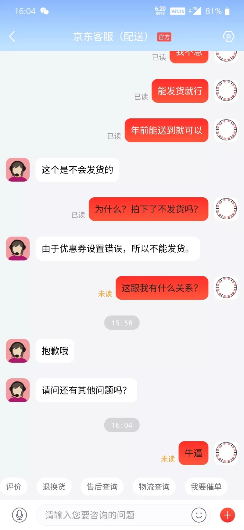 想问问大家,这种京东自己设置错优惠券,我刚好使用了(不是恶意下单)需要取消订单吗?而且京东客服这个态度实属恶心。