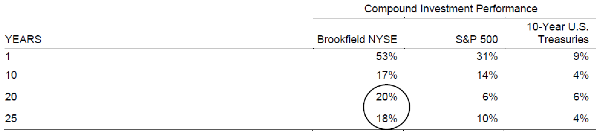 作为投资者可以获得的回报的一个指标,下面是我们过去25年来年度化复合投资回报的最新列表。举个例子,25年前在布鲁克菲尔德资产管理公司投资的1000美元,如今价值刚刚超过62000美元。
