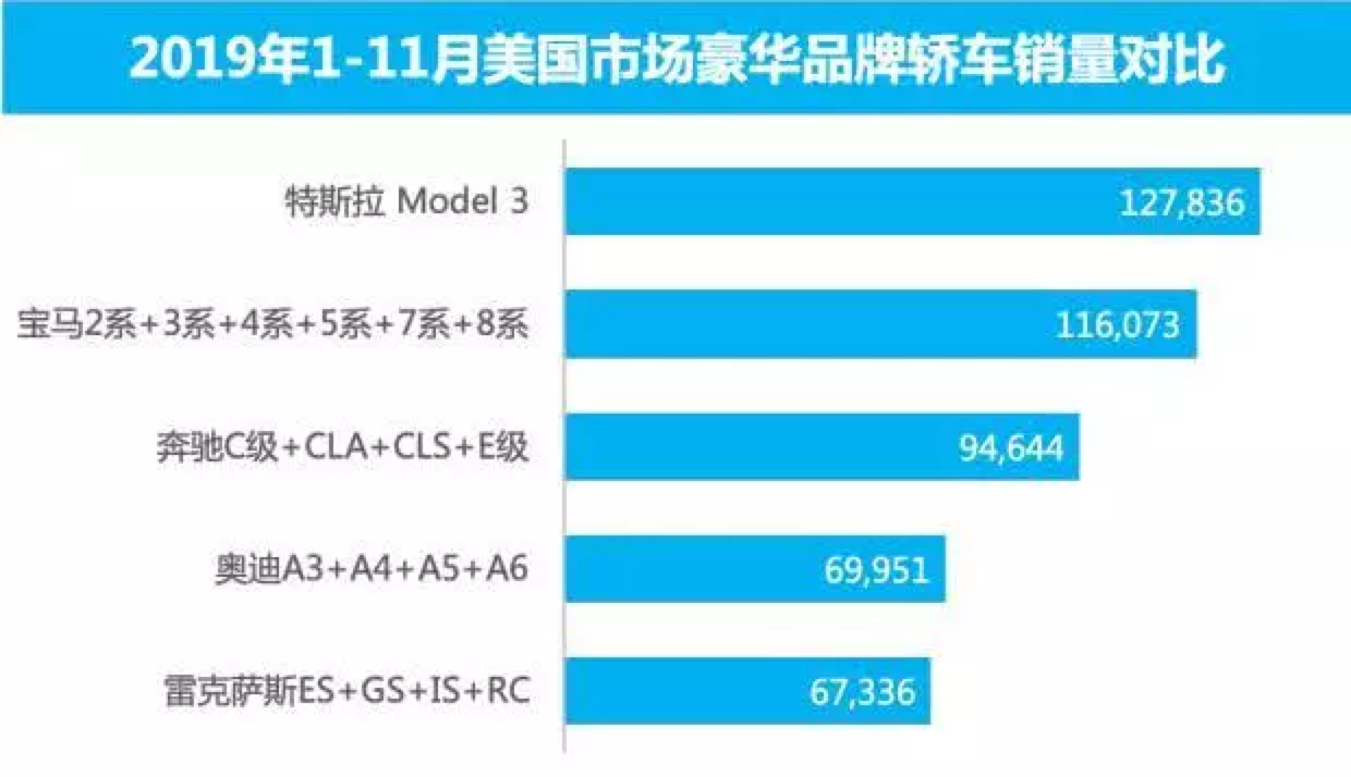 首先就是从今年的销量来看在美国市场 model3可以说是一枝独秀 一车之力 碾压BBA 一张图说明一切