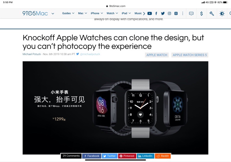 这个是美国的网站9to5Mac 专门放苹果的新闻 浏览的时候看到这文章 真的气死了 活该被嘲讽 因为我国没有设计专利这一说 所以这样的抄袭没有任何代价 说实话这样的产品真的不该支持 尤其是小米这样的大公司 你已经是在香港上市的大公司了啊 看看Fitbit 人家再怎么努力也没能竞争过苹果 最后被Google收购 可是人家也从没干过这事(当然美国法律也不允许)