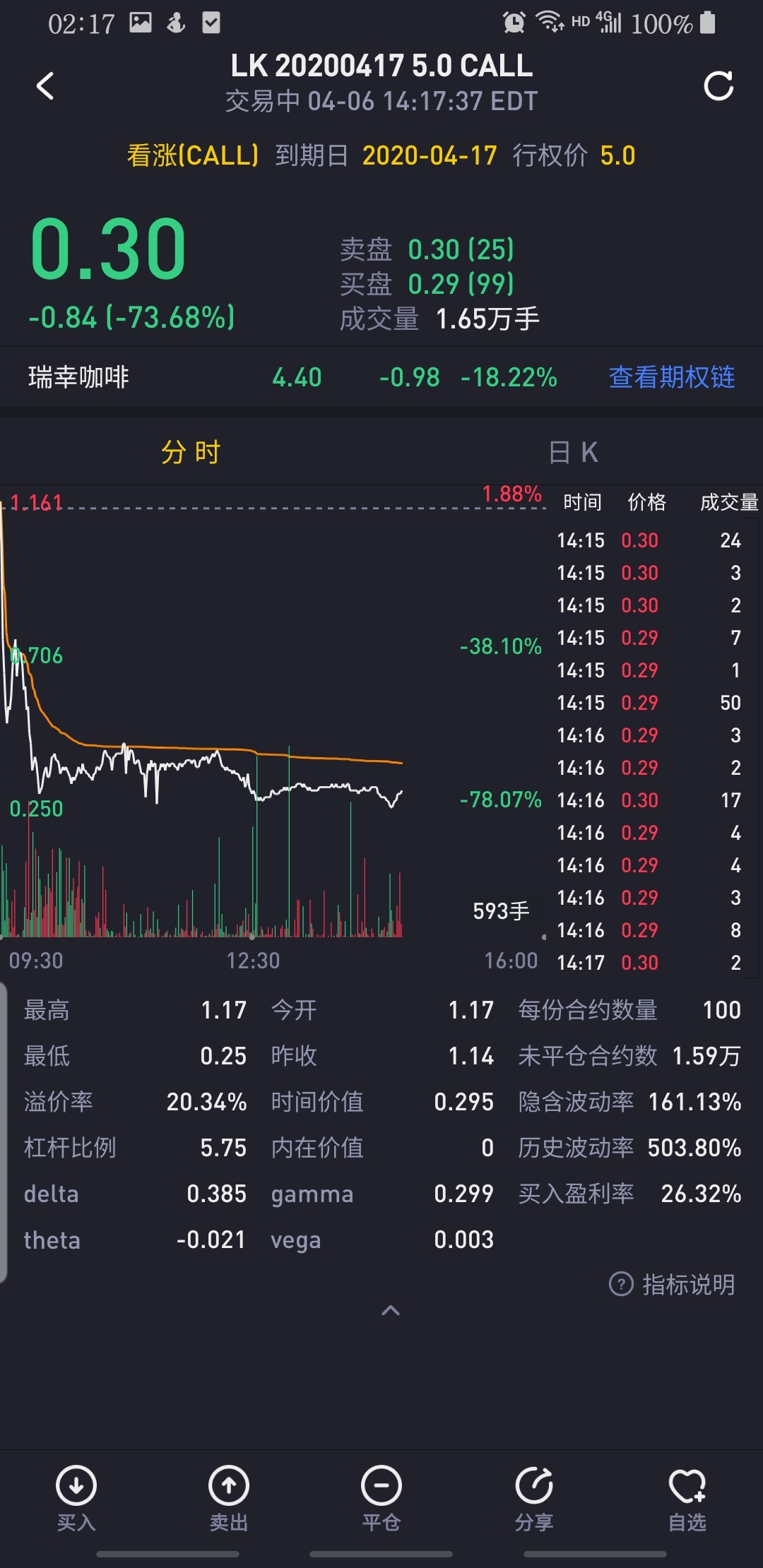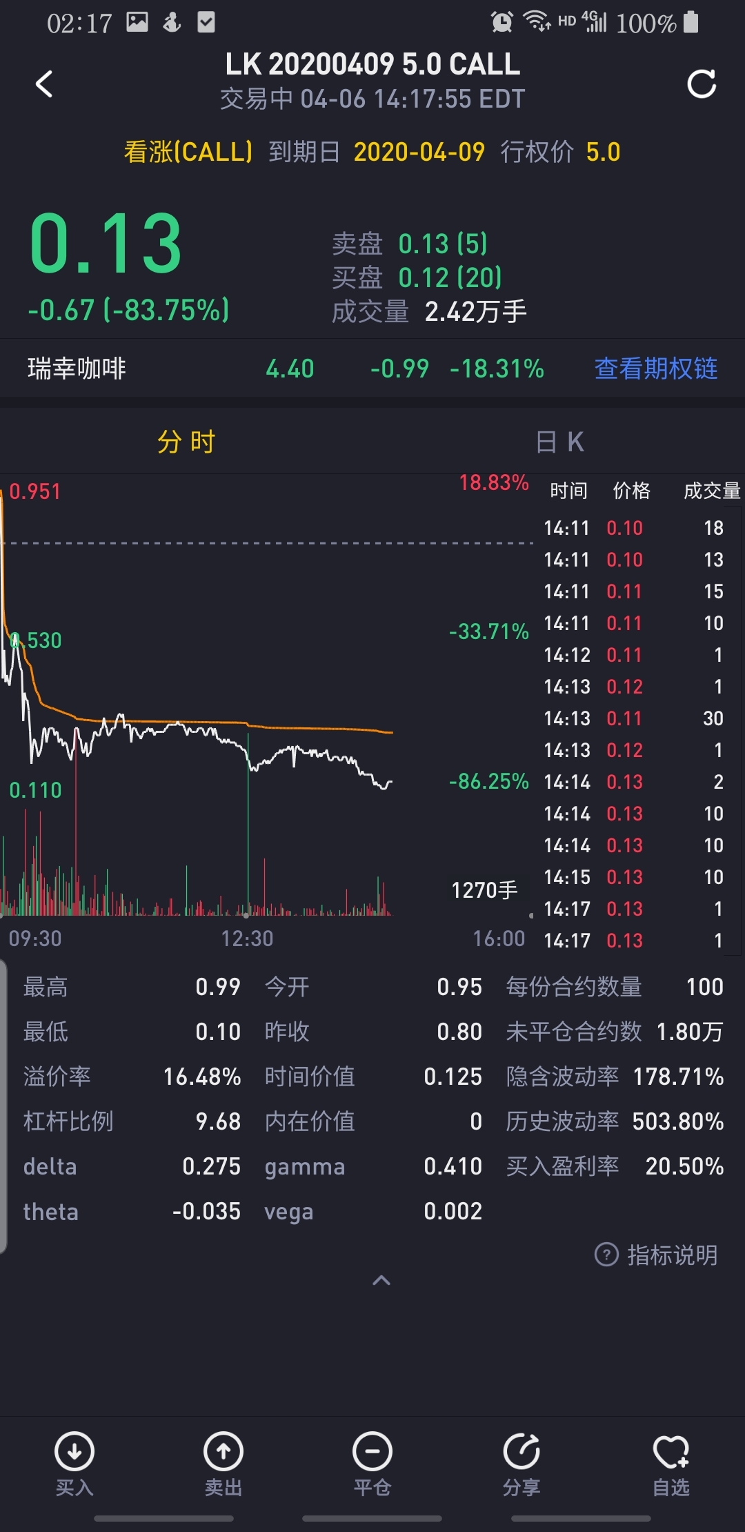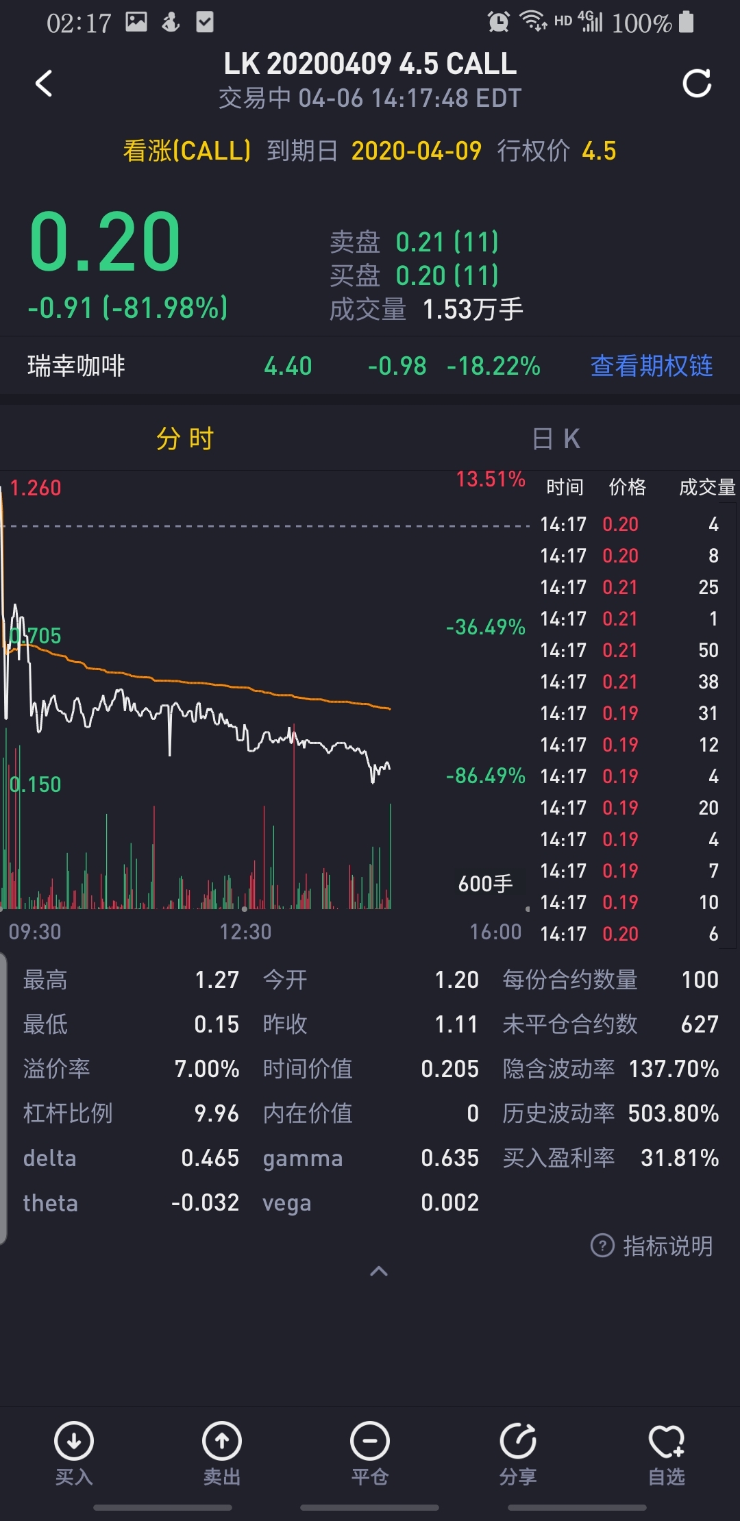 $瑞幸咖啡(LK)$瑞幸咖啡可能迎来短暂反弹,目前有将近7万手的看涨期权成交,以最低0.2成本价估算,近1000万人民币,同时看跌期权均不超过一万手,预计有机构作妖。如果推高到合适价位,这些看多期权绝不止十倍收益。
