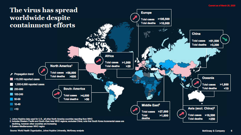 首先现在全球疫情最严重为美国、意大利、西班牙等欧美国家,亚洲目前韩国和日本正努力控制疫情。目前中国已基本控制,对海外入境人员也积极实施集中隔离观察。 下图为目前全球疫情的情况。