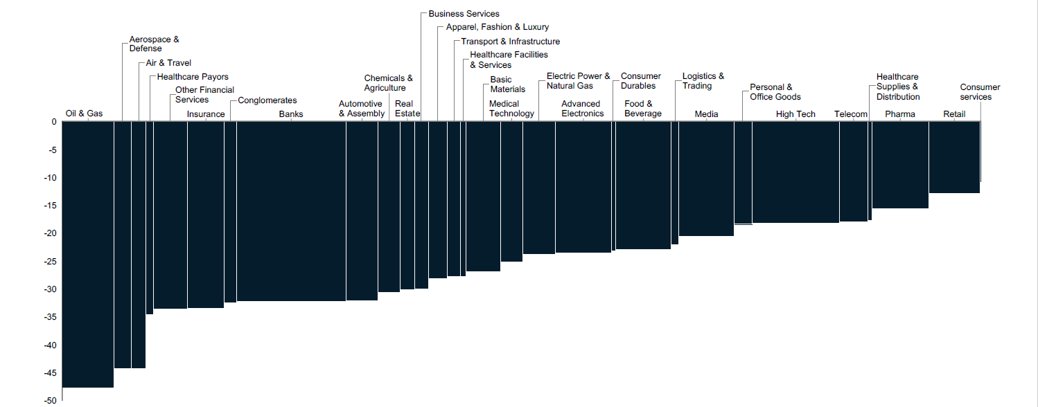 最近的大跌按板块来看能源板块以原油为首已跌近50%,消费类板块跌幅超过25%,跌幅最少的零售也有接近20%的跌幅。从上图可以看出,海外疫情爆发短短几周金融市场便受到了重大的打击,大部分的产业都将受到重大的影响。