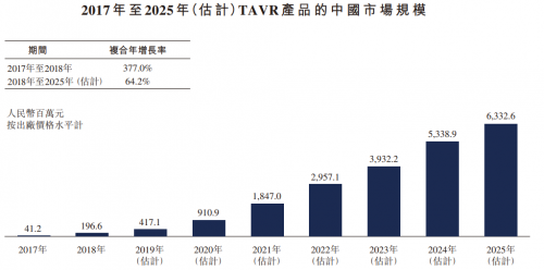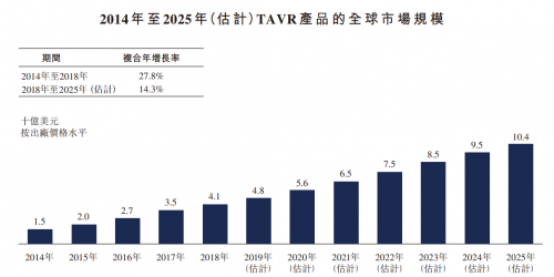 全球TAVR产品市场预期将由2018年的41亿美元增至2025年的104亿美元,复合年增长率为14.3%。中国的TAVR产品市场将由2018年的1.97亿以复合年增长率64.2%的速度增至2025年的63.3亿。