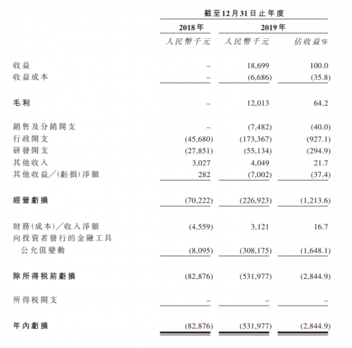 截止19年12月31日,财务数据显示,公司2018年没有收益,期内亏损8287.60万元,2019年实现收益1869万元,收益成本668万元,毛利率64.2%,同期亏损5.3亿元。