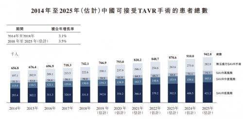 此外,从TAVR的市场潜力来看,国内市场可接受TAVR手术的患者人数由2014年的65.7万人增加至2018年的74.2万人,复合年增长率为3.1%,且估计将于2025年进一步增至94.3万人,2018—2025年的复合年增长率为3.5%。